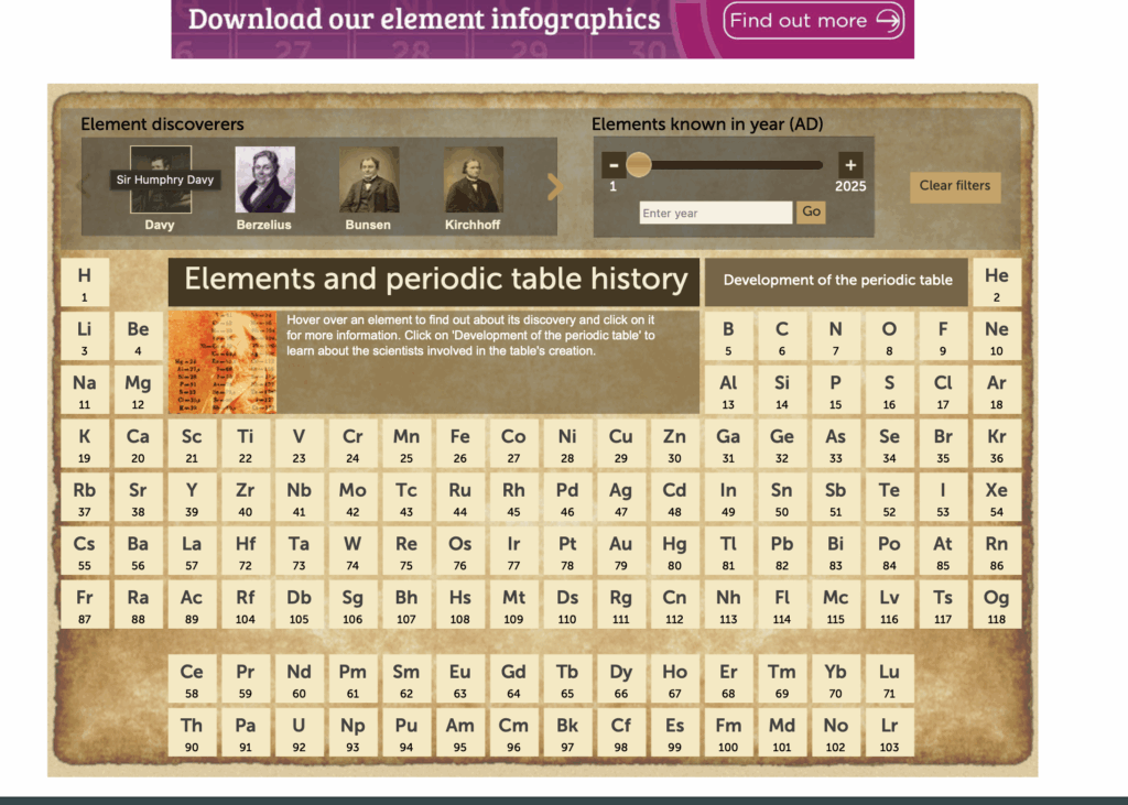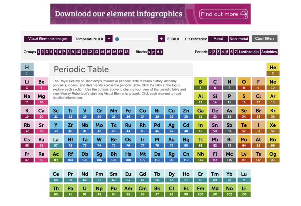 The Periodic Table website is an interactive site that allows students to explore, learn, and gain a better holistic understanding of chemistry. When the user first enters the site, they will encounter a standard periodic table and six different tabs, ranging from “History” to “Podcast” to “Video.” While all six tabs are helpful, the home page and the three that I mentioned previously are likely what students will use the most. In the history section of the periodic table, students can click on an element and then be directed to a page that provides information on the element itself, its discovery, and general details about its historical significance. Next, the video section will feature the same layout as the history section. However, this time, when the user clicks on an element, it will redirect them to a video explaining that aspect through a visual format. Likewise, in the podcast section, the format remains the same, but this time, it is presented through a podcast, typically averaging around 5 minutes.